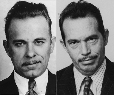 Any idea of the story behind these? The photo on the right would fit with the post-breakout sequence, but Dillinger only wears his solid black vest and white shirt in that scene… sadly, no mustache either.