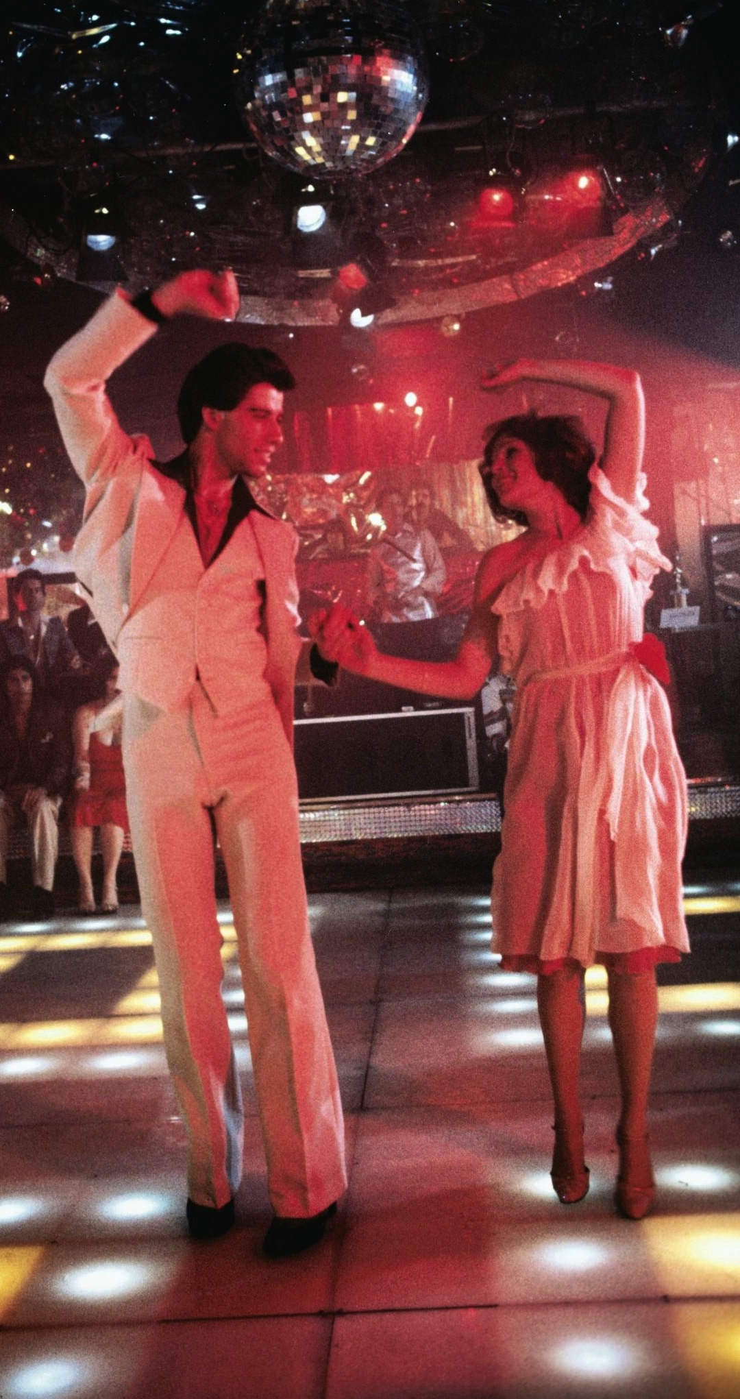 John Travolta and Karen Lynn Gorney in an iconic promotional image for Saturday Night Fever (1977).