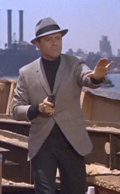 By the mid-1960s, JFK had already established himself as the “hatless” president and the concept of a man’s daily hat was rapidly falling out of fashion. Stanley Ford doesn’t wear one in his normal life, but a fedora is essential to the image of his old-fashioned bastion of American masculinity, Bash Brannigan. When venturing out as Bash, Stanley wears a gray felt short-brimmed fedora with a black grosgrain ribbon.