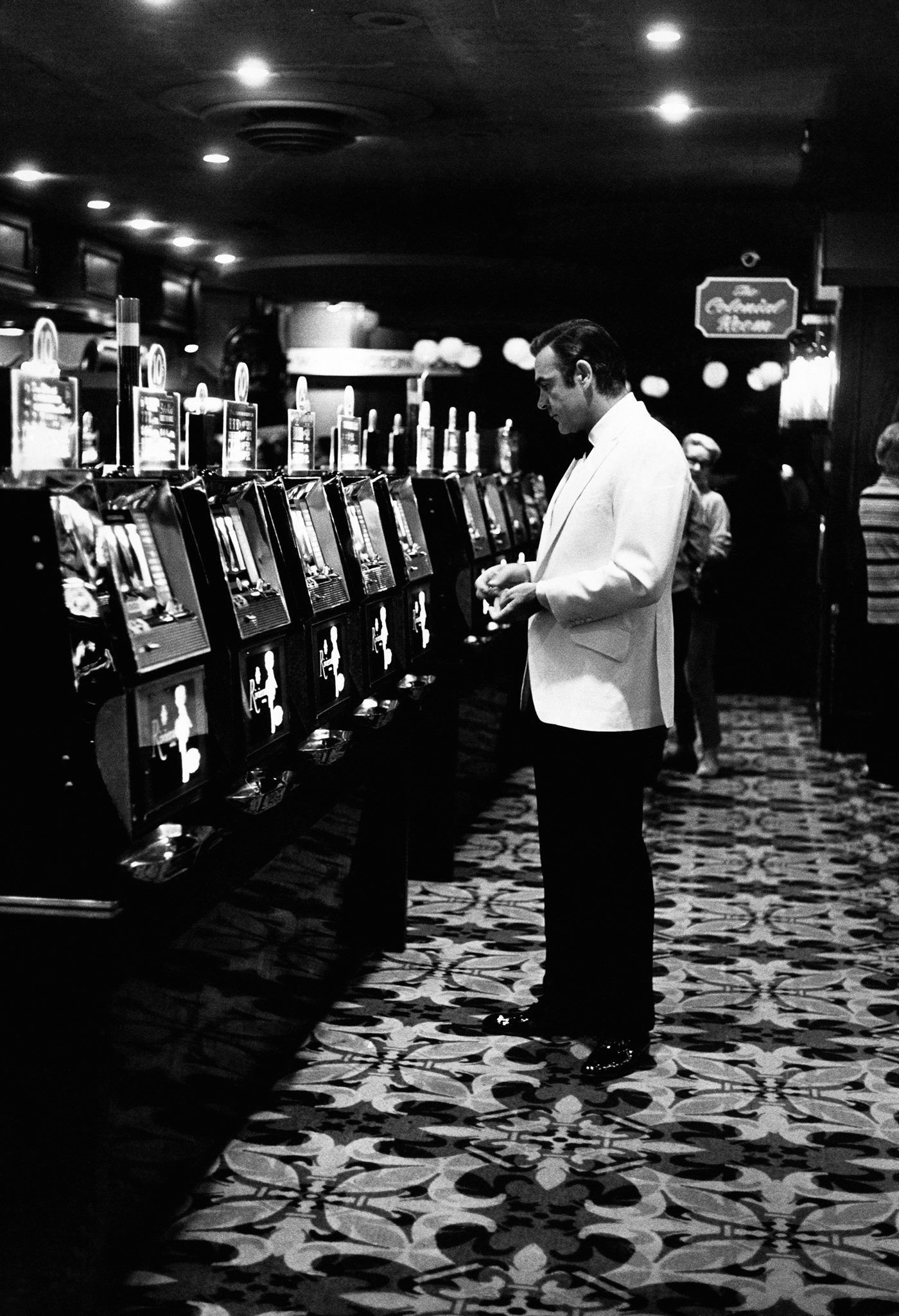 Bond’s white dinner jacket for the Whyte House hotel and casino may be overdressing, but there’s no denying that he stands out among the sea of garish polyester jackets and Ban-Lon sport shirts.