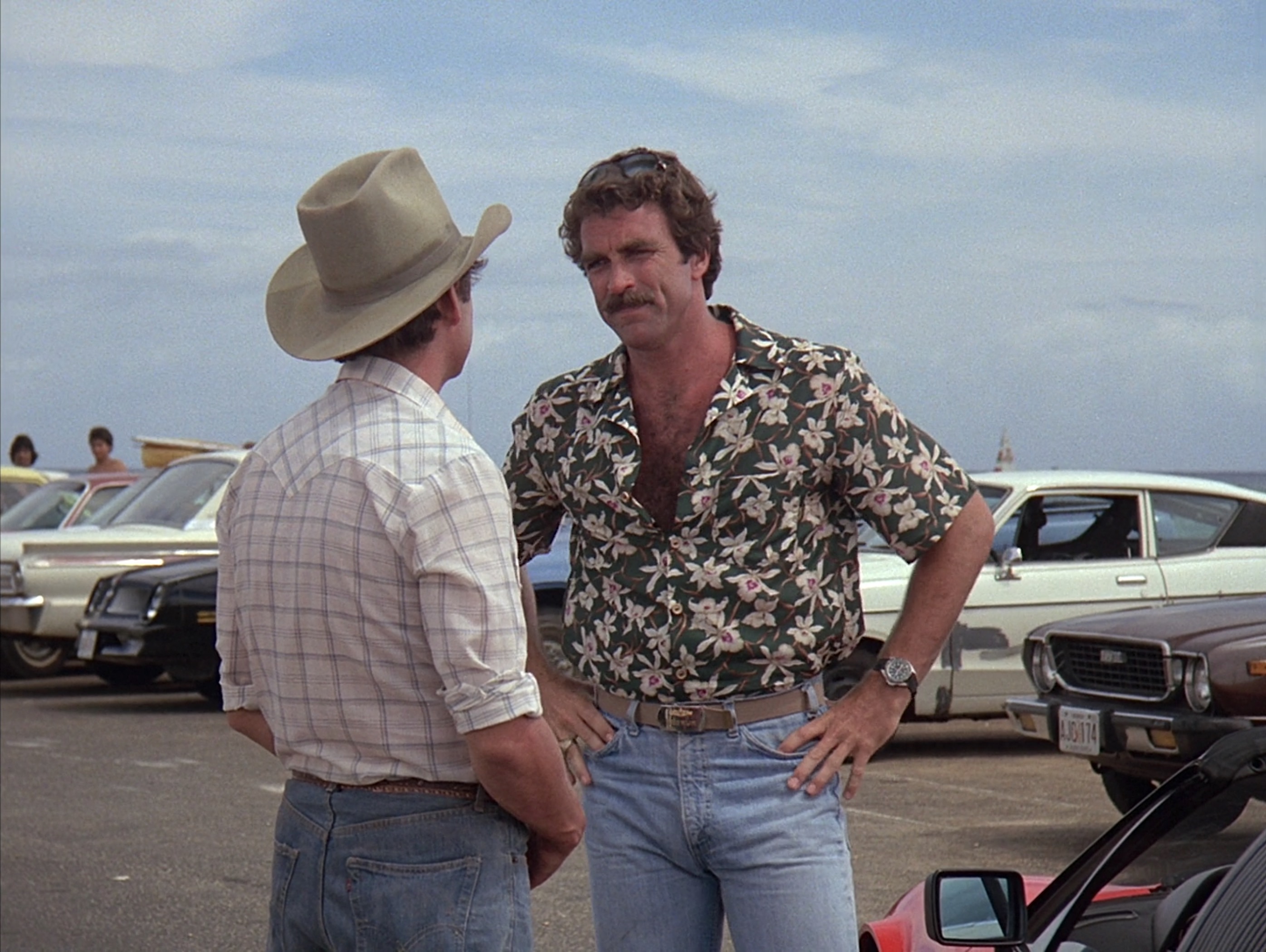 Peep the orange tab on Peeping Tom’s Levi’s in this scene from the first episode, “Don’t Eat the Snow in Hawaii, Part 1.” Magnum also wouldn’t start wearing his personalized surface warfare belt buckle until the following season.