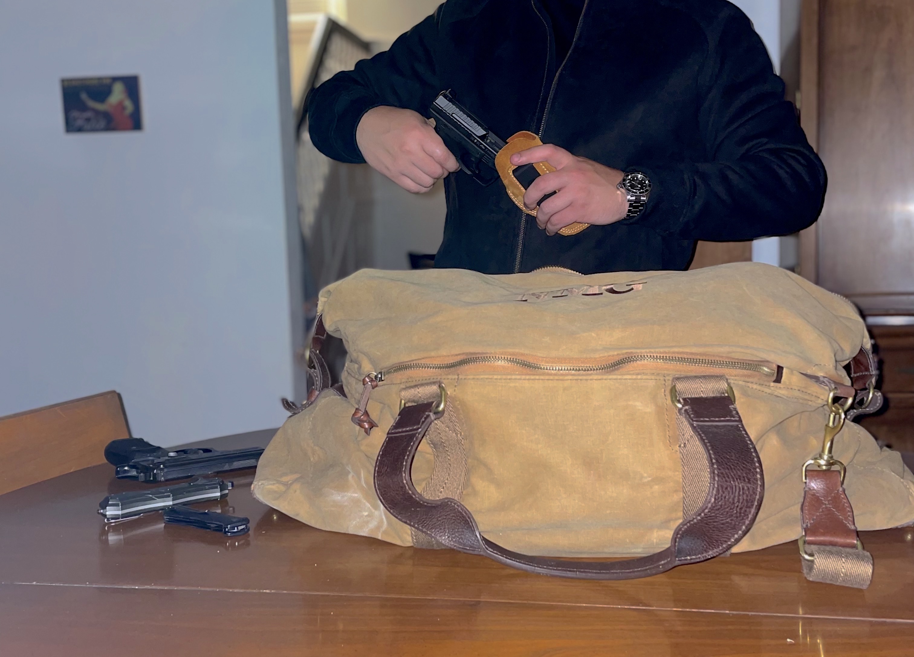 Yours truly recreates a Spectre moment with the khaki waxed cotton J. Crew Abingdon Weekender bag. (Also featured: a black “veggie suede” Banana Republic bomber jacket, black merino wool Gap turtleneck, steel Invicta Pro Diver “Submariner-tribute” watch, Walther P99AS and cognac suede Vega IWB holster.)
