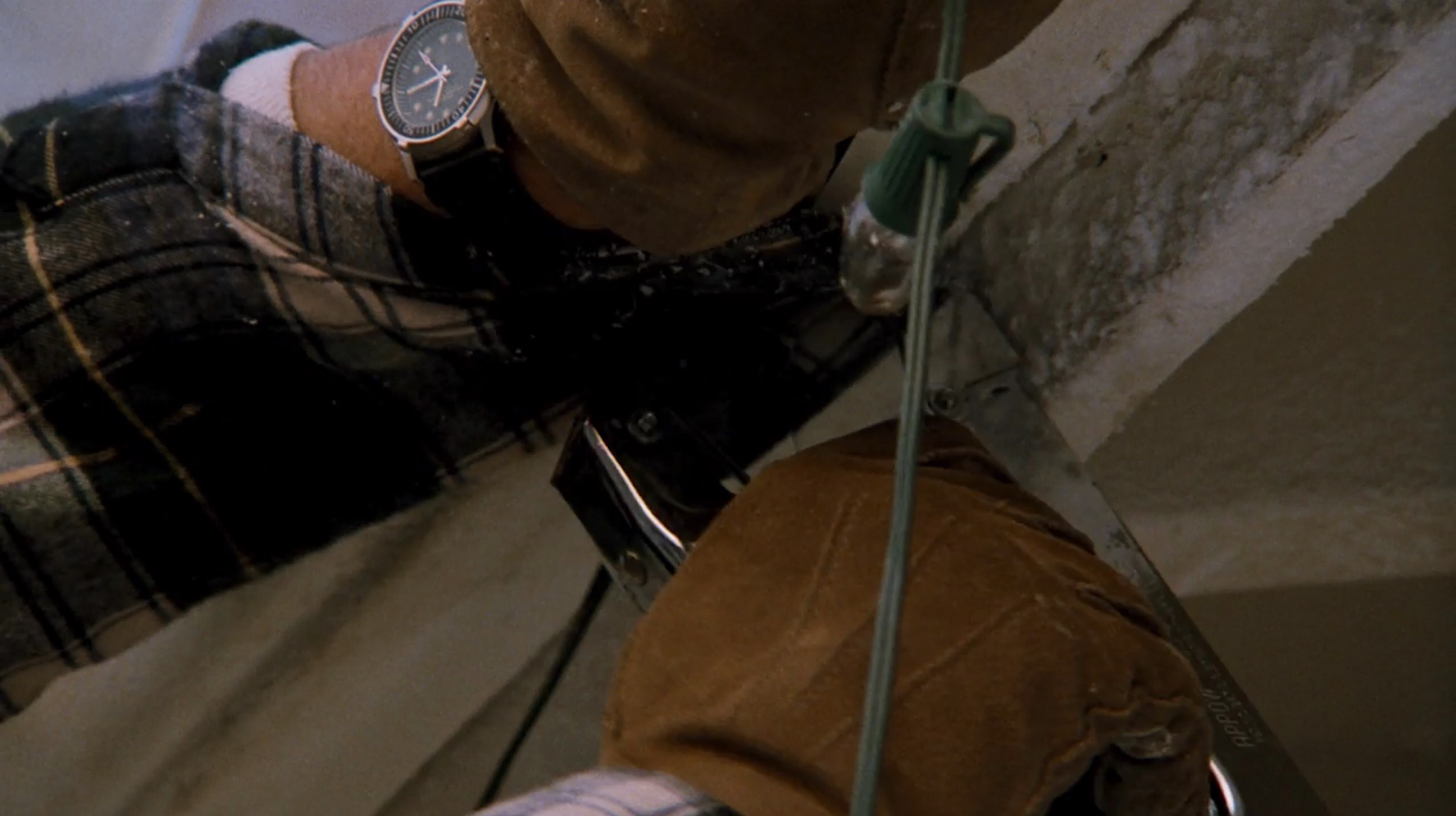 Most clearly seen in the earlier scenes as he hangs Christmas lights, Clark wears a stainless steel dive watch with a black bezel, black dial with luminous non-numeric hour indices, and black center-ridged leather strap.