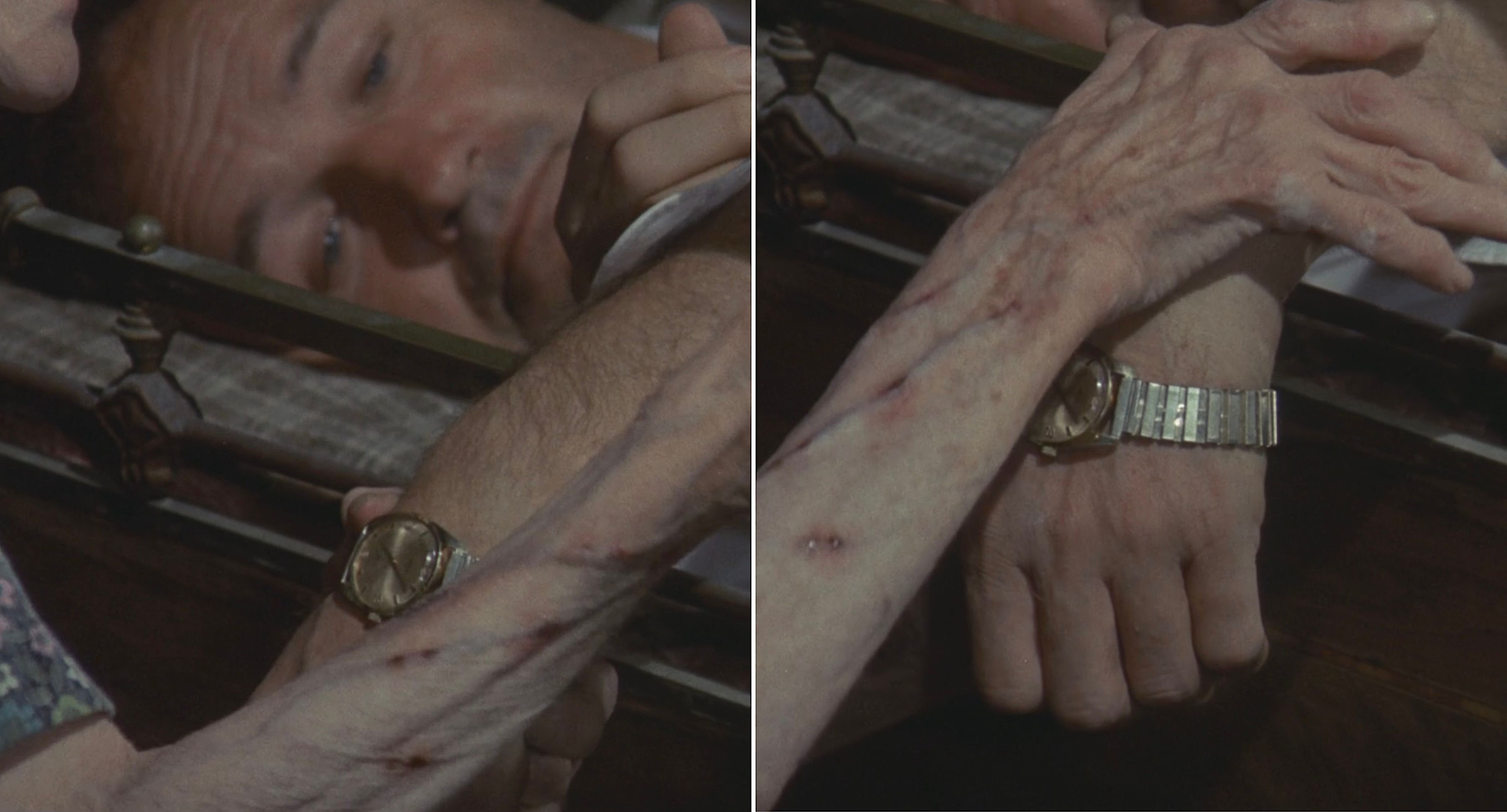 Rather than the Timex Marlin he wore in The French Connection, Popeye now sports an all-gold watch with a round gold “pie-pan” dial on a gold straight-link expansion band, which gets slipped off his left wrist and stolen by an old junkie (Cathleen Nesbitt) while in his heroin-induced daze. Unfortunately, the watch is never returned to him so he doesn’t have it for the finale.